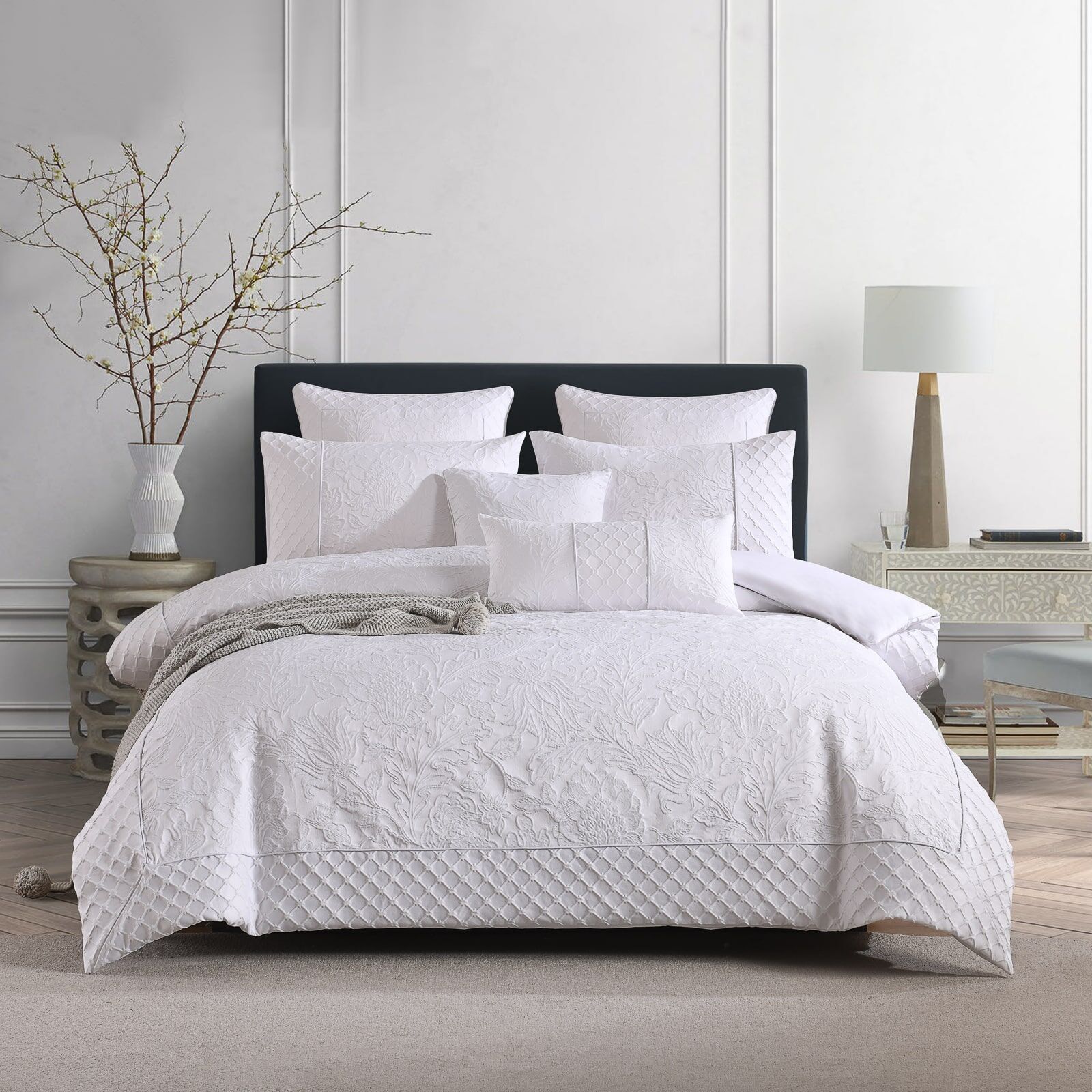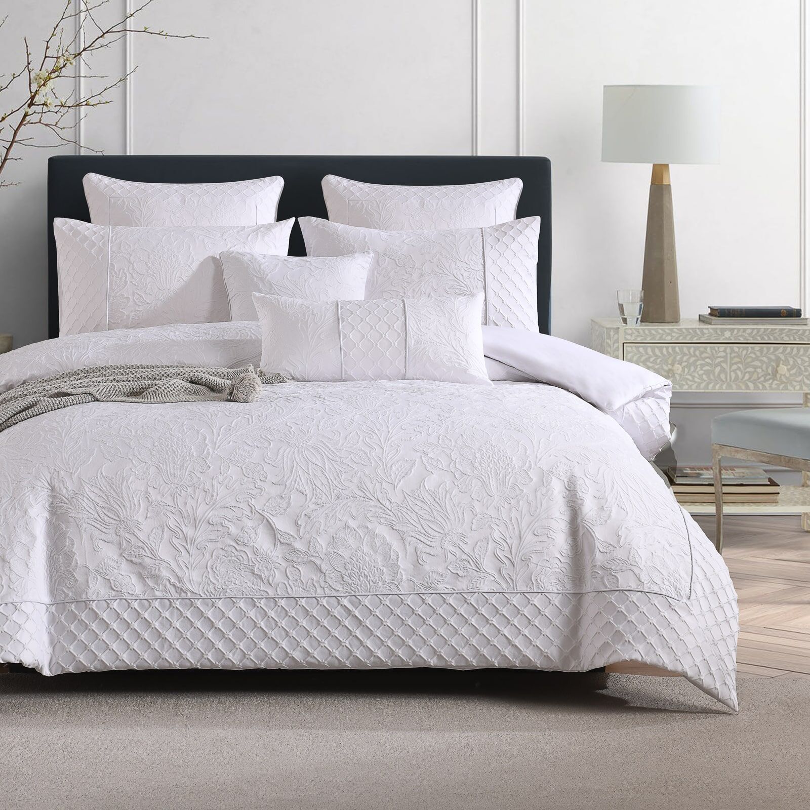 Step into refined comfort with the Artistelle Quilt Cover Set by Linen Studio. A dense cotton-blend jacquard front adds rich, understated texture, while the smooth cotton-blend reverse keeps the feel breathable and comfortable. The crisp white palette brings a clean, elevated look—perfect for bedrooms that favour polished simplicity over loud pattern.