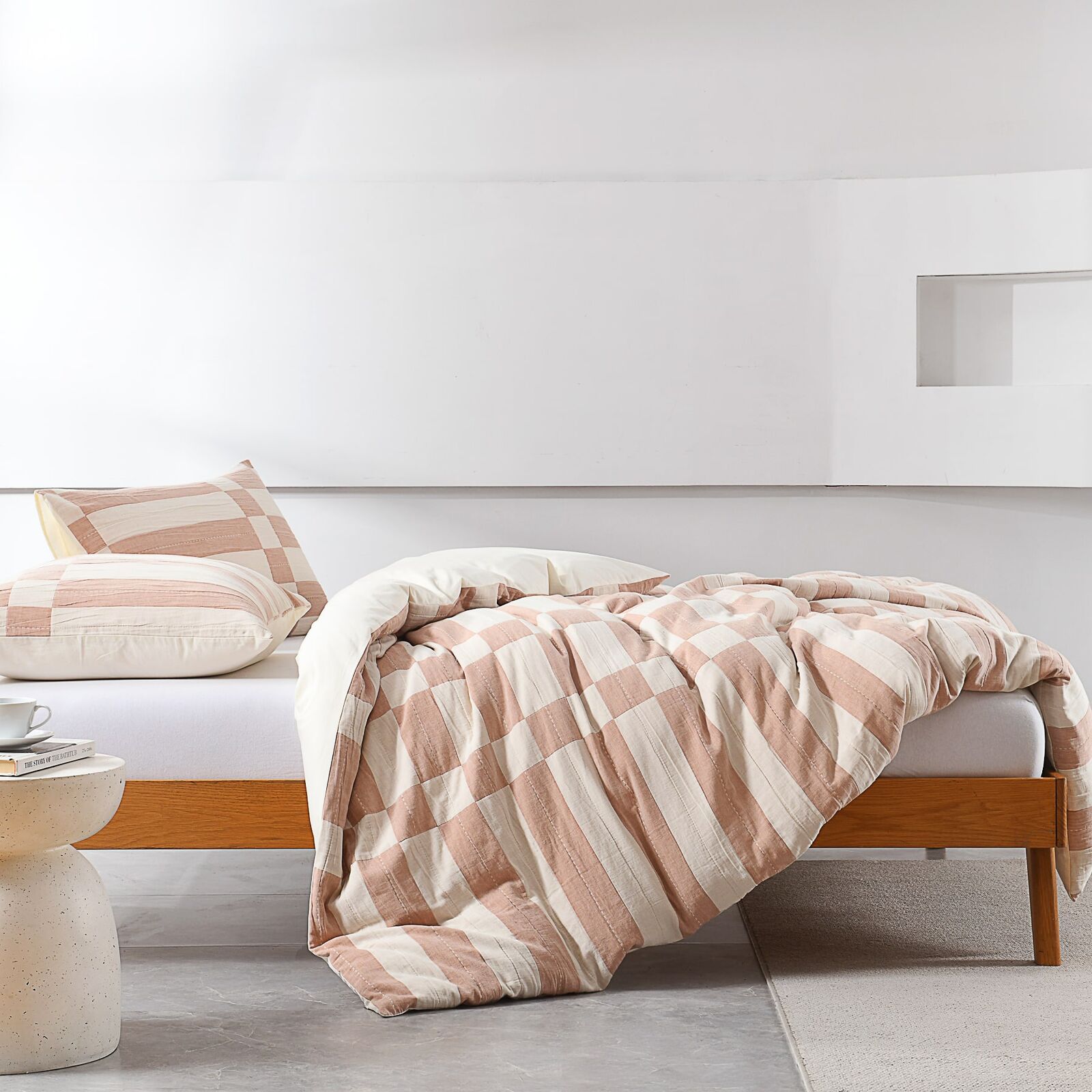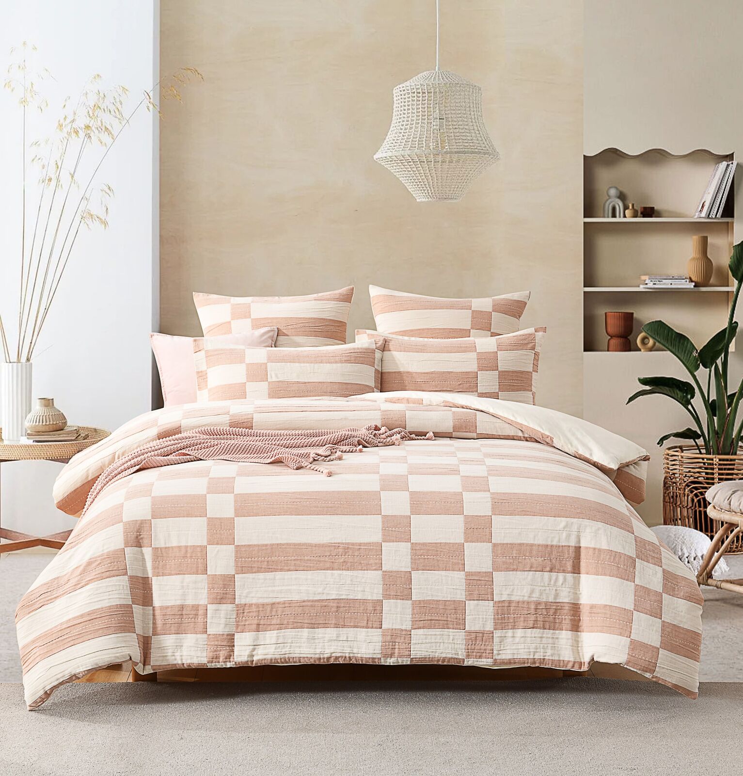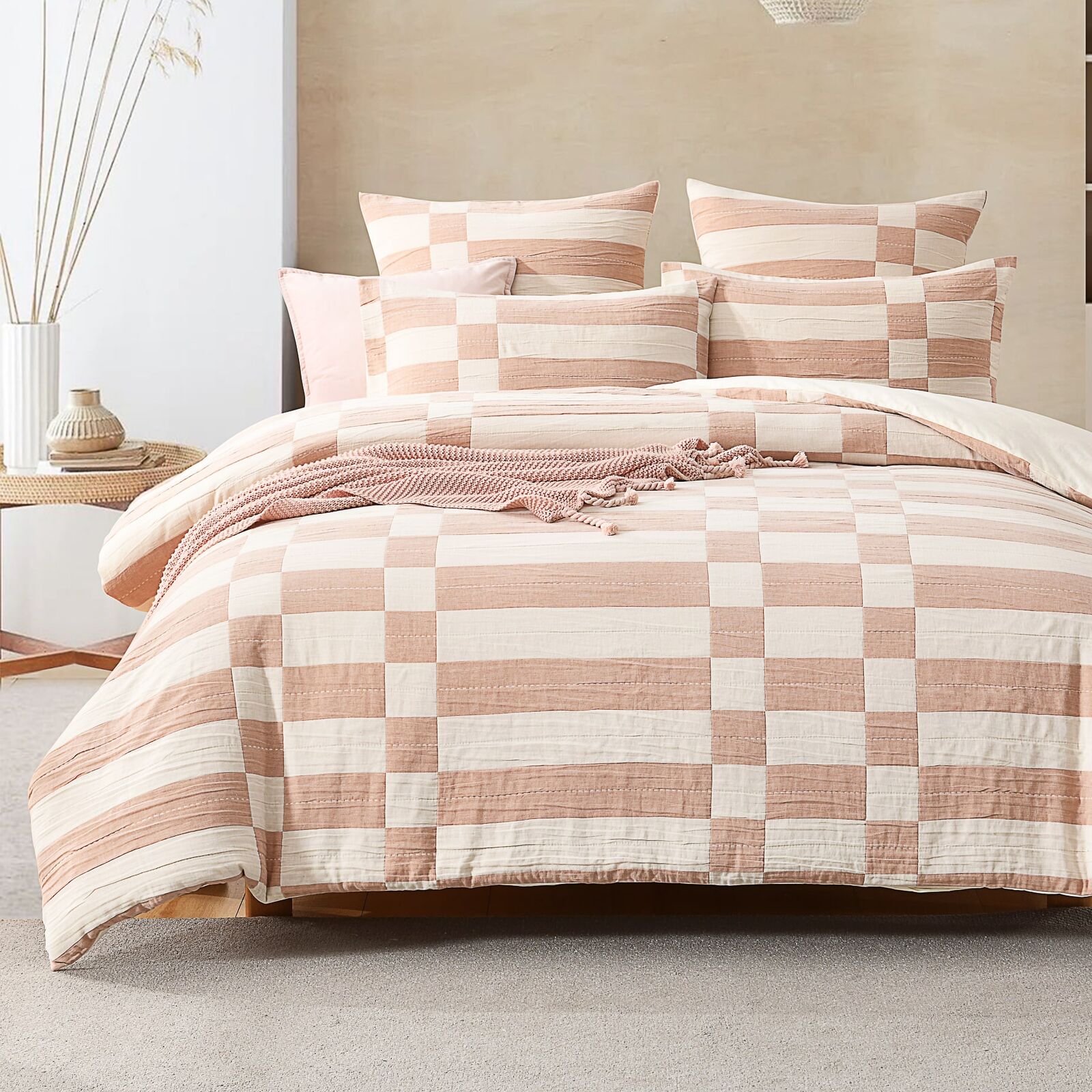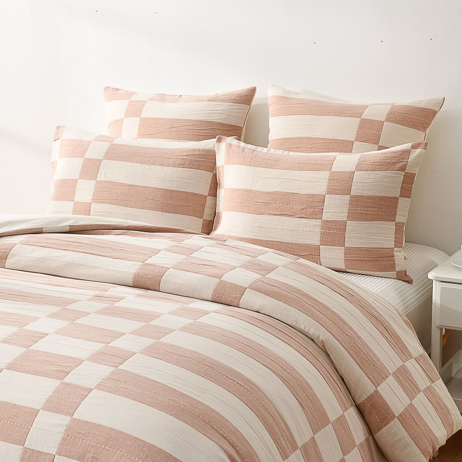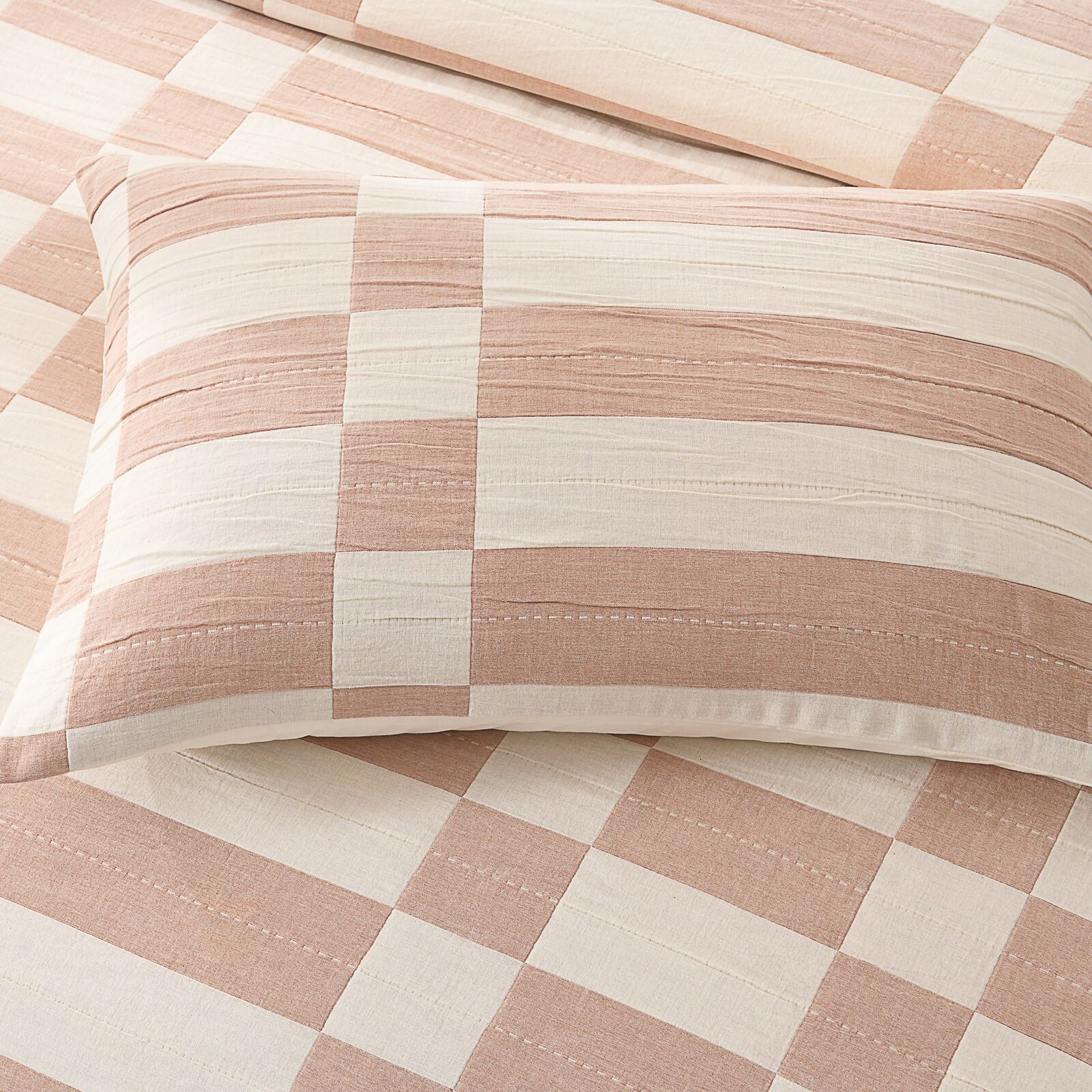 The Sundown Patchwork Cushion Cover by Linen Studio delivers that handcrafted, sun-washed aesthetic everyone tries to fake but rarely gets right. Its woven cotton front features a soft block-patterned mix of muted clay and warm ivory, giving the piece an earthy, lived-in appeal. Subtle stitched detailing runs through each panel, adding quiet texture without shouting for attention. Finished with a smooth cotton reverse, this cushion slips effortlessly into calm, natural interiors—perfect for layering, softening a space, and giving your room that relaxed, artisan-made edge.