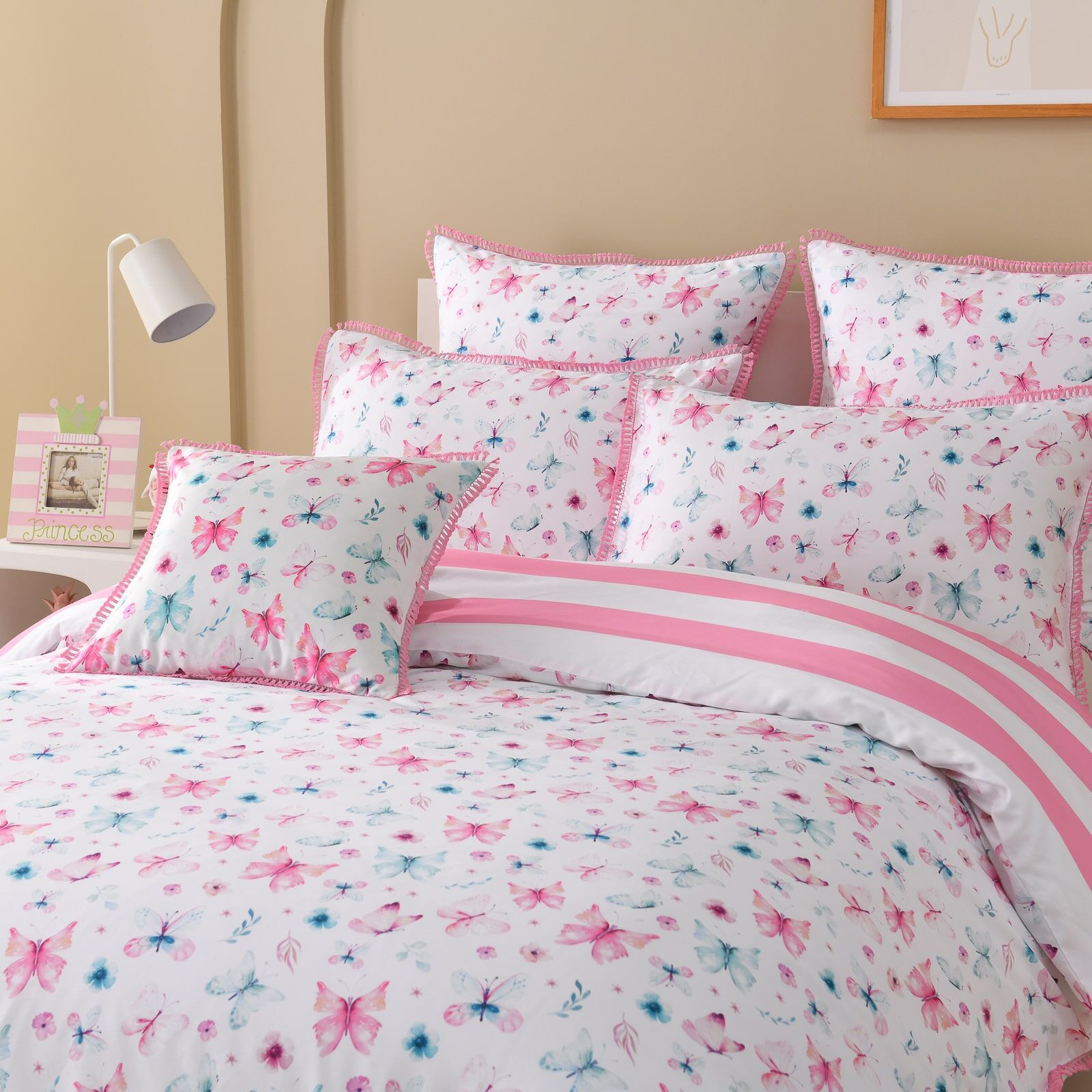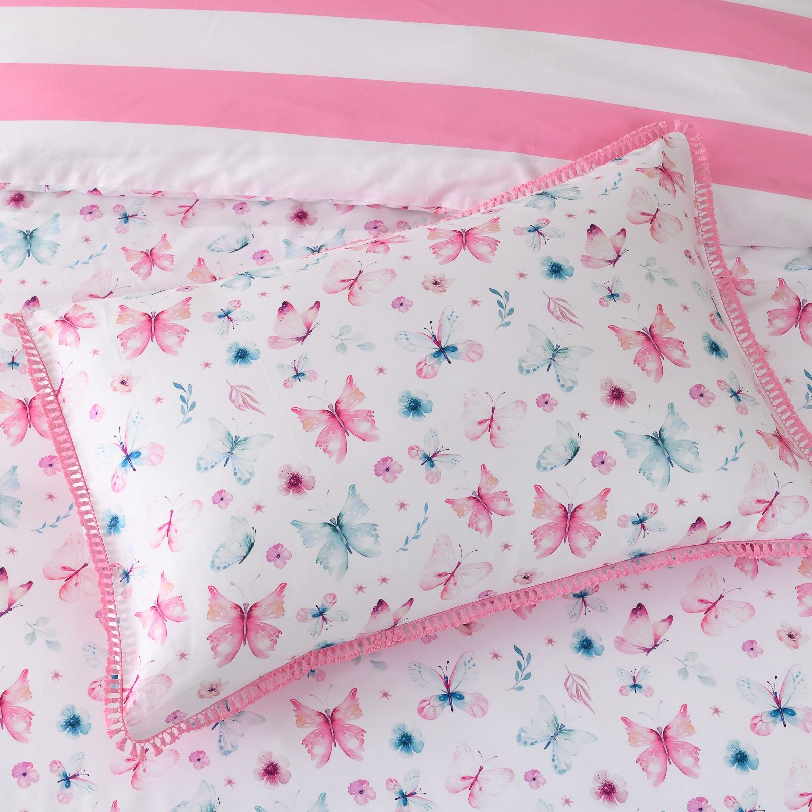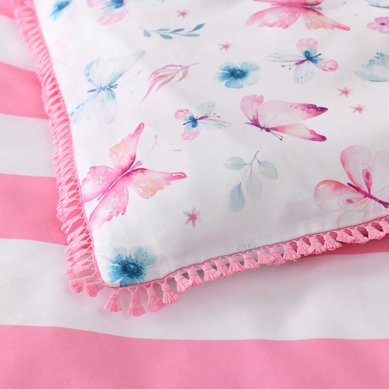 The Nora Quilt Cover Set by Linen Studio Kids features an intricate and colorful butterfly print, delicately scattered across a soft white backdrop. Accented in blush pink and cool blue, the design is framed by a tassel fringe edge and paired with a fine stripe reverse—bringing a touch of whimsy and calm sophistication to modern kids’ rooms.