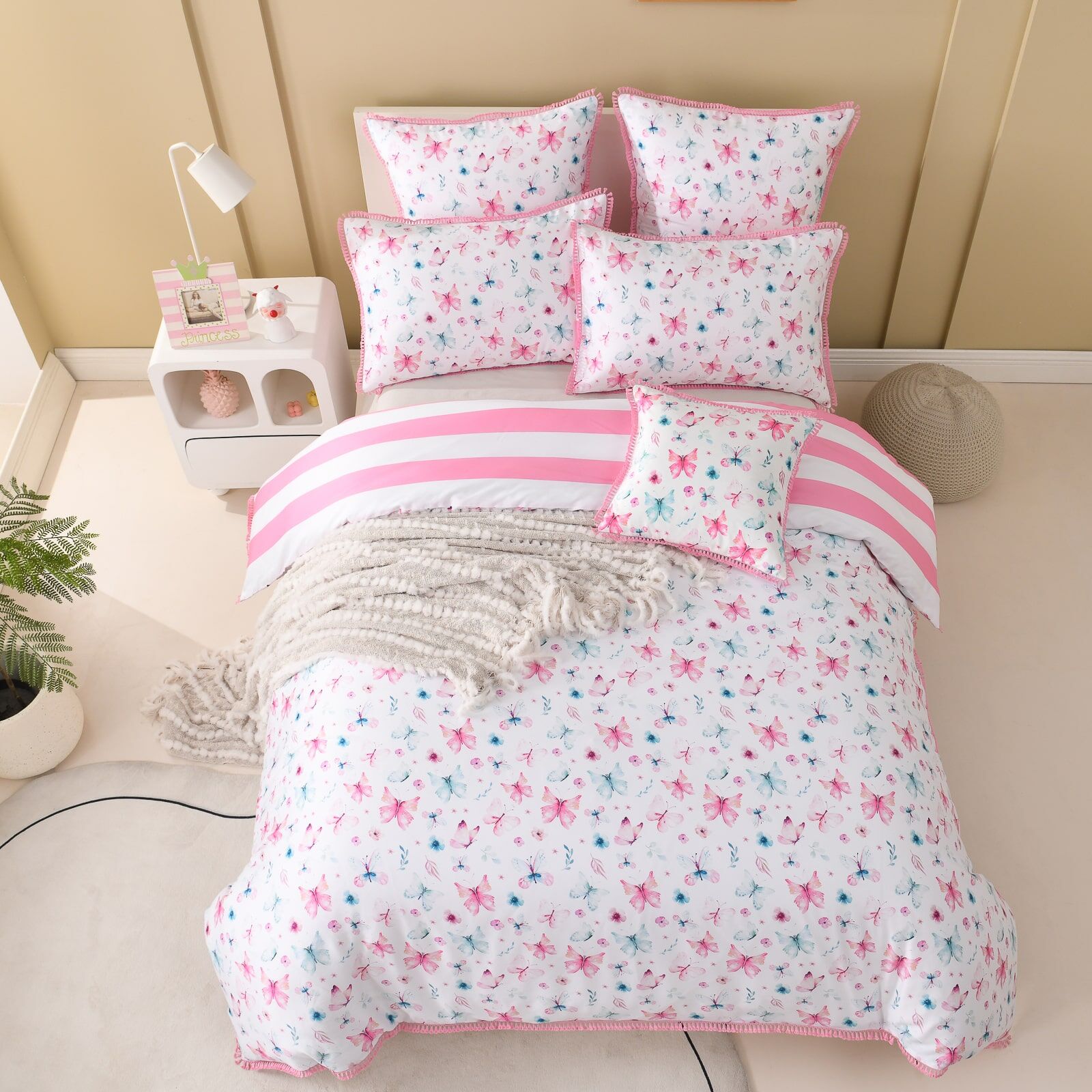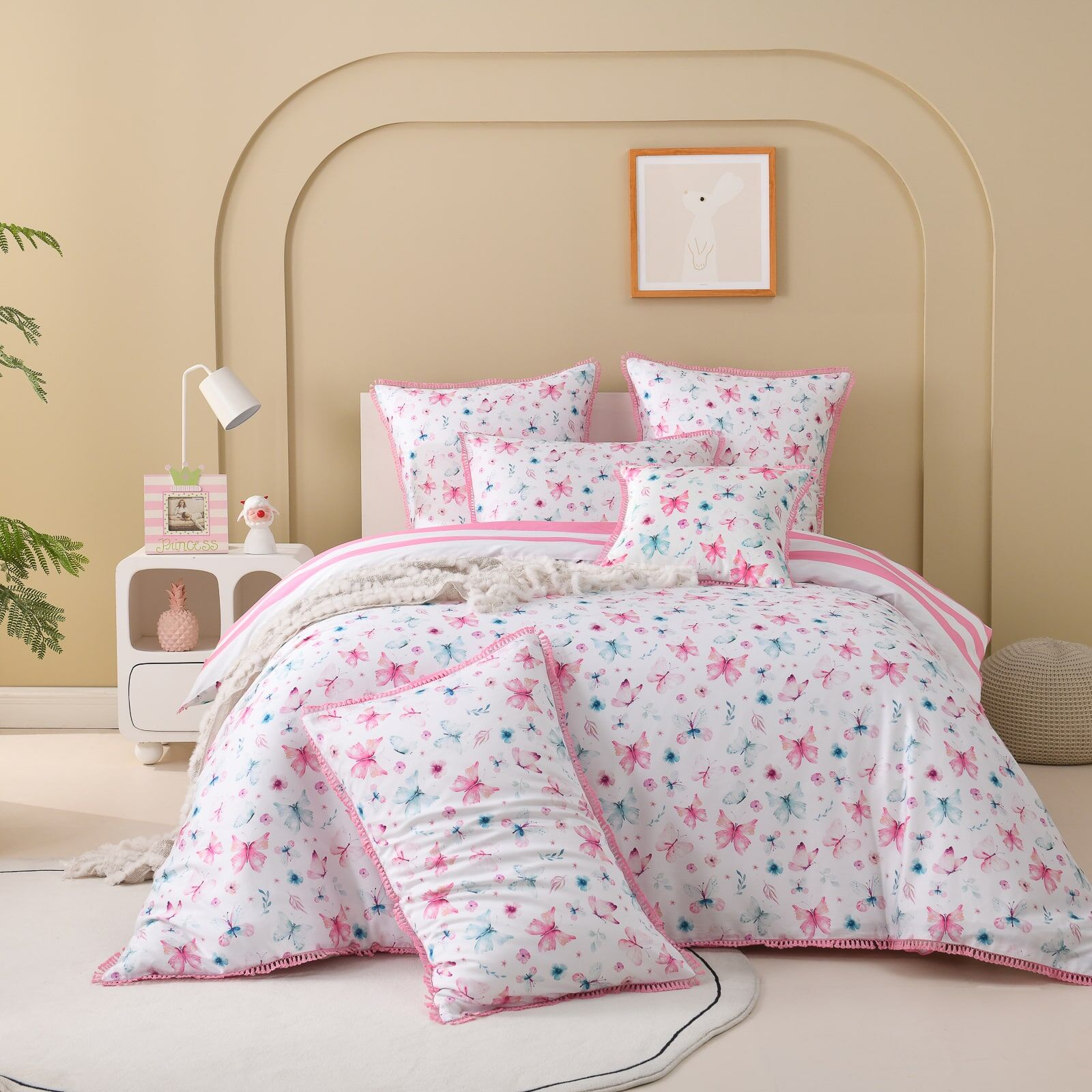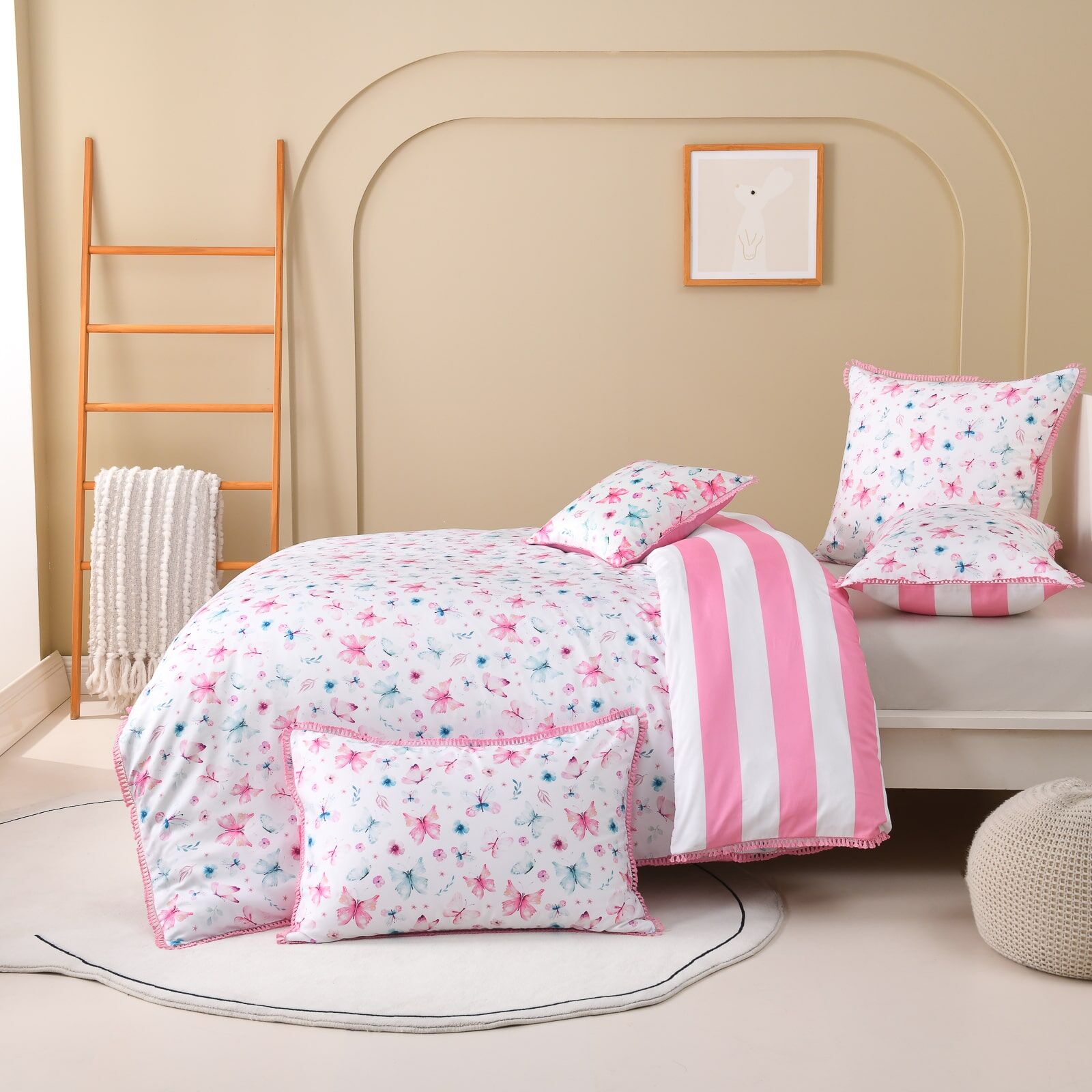 The Nora Quilt Cover Set by Linen Studio Kids features an intricate and colorful butterfly print, delicately scattered across a soft white backdrop. Accented in blush pink and cool blue, the design is framed by a tassel fringe edge and paired with a fine stripe reverse—bringing a touch of whimsy and calm sophistication to modern kids’ rooms.