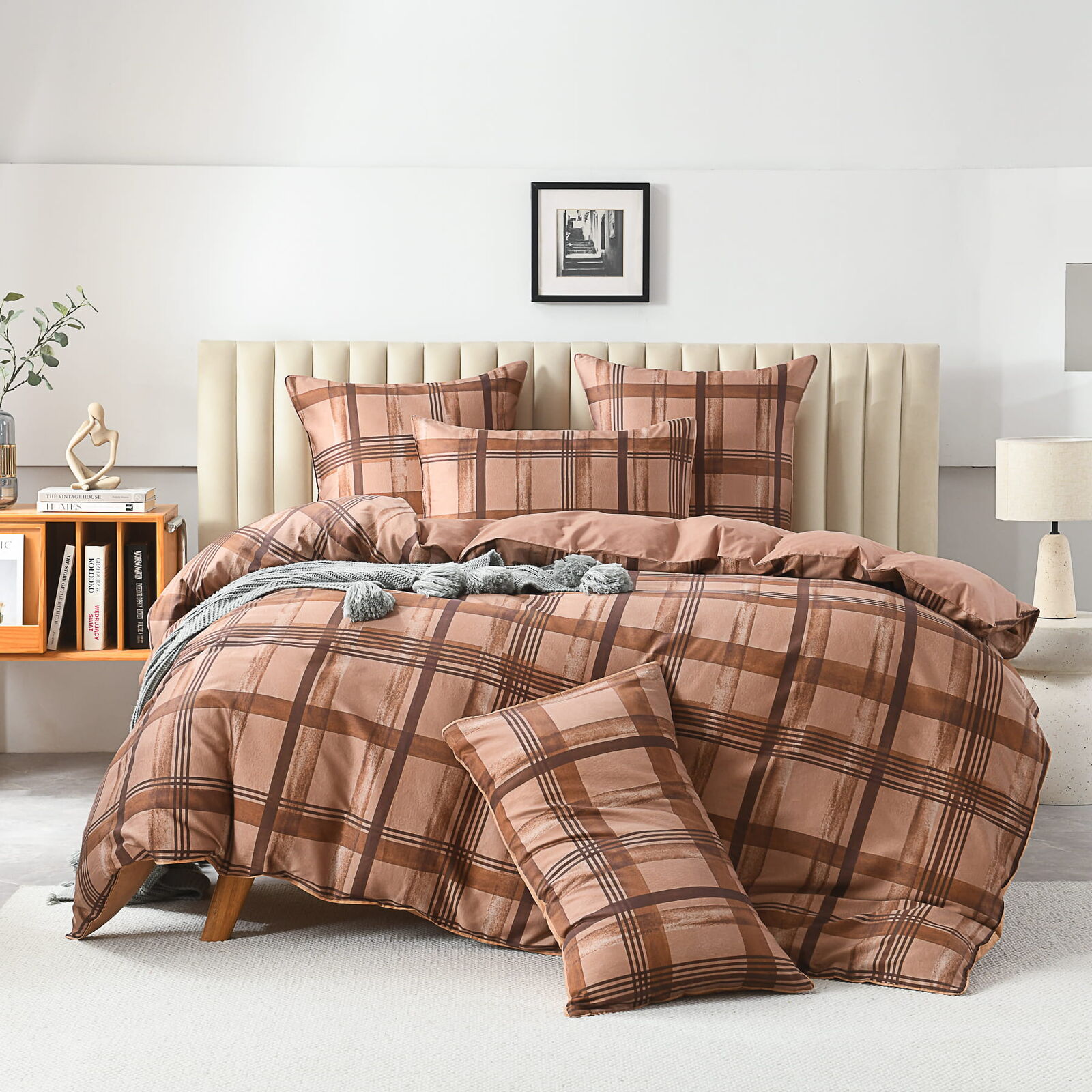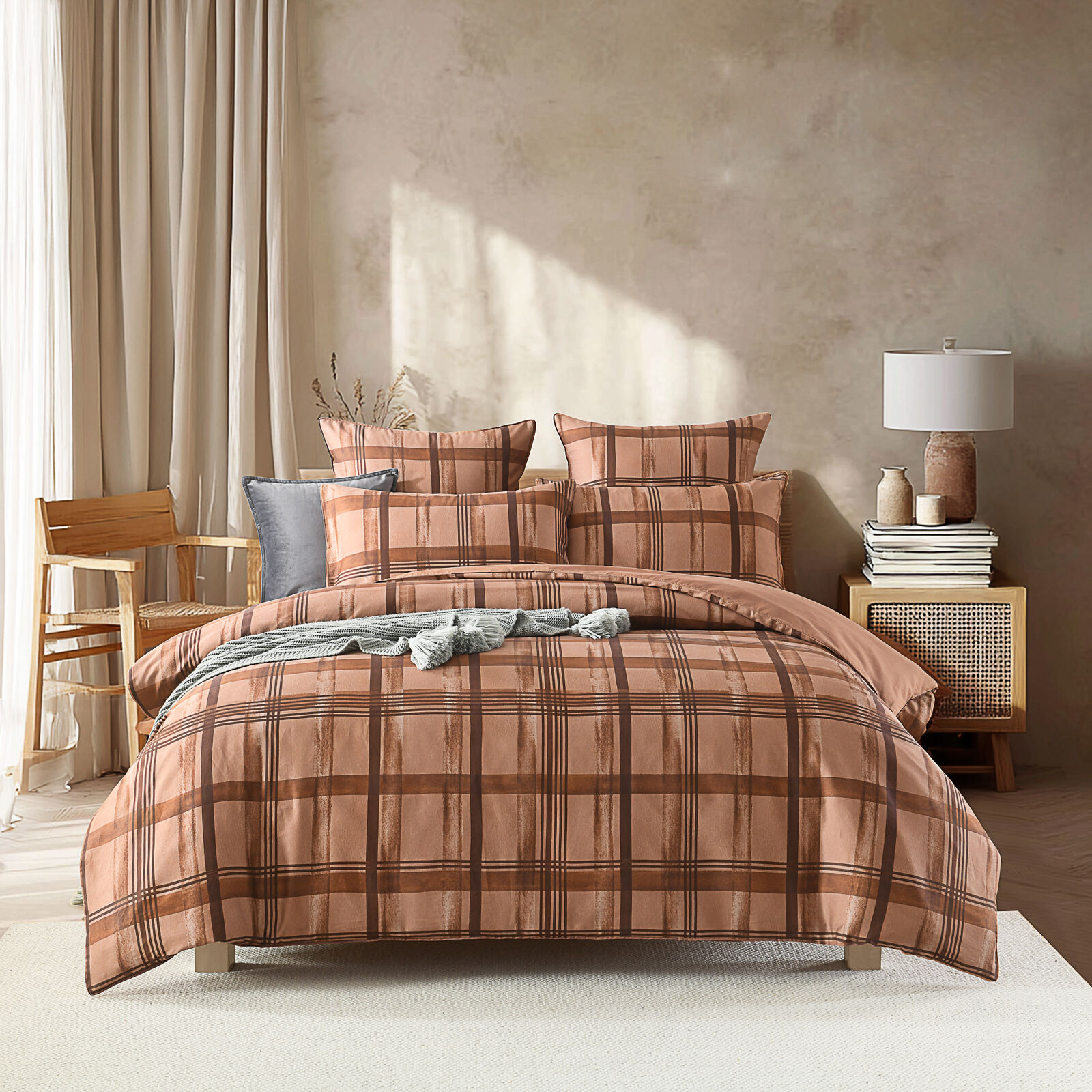 The Wentworth Quilt Cover Set by Linen Studio delivers a refined, contemporary take on classic check styling. Showcasing a layered plaid design in washed Orange, brown, and copper tones, it creates a structured yet relaxed bedroom aesthetic. The painterly texture within the check adds depth and subtle movement, preventing the pattern from feeling flat or rigid. Finished with a solid orange reverse, this set offers versatile styling while maintaining a calm, coastal-inspired feel.