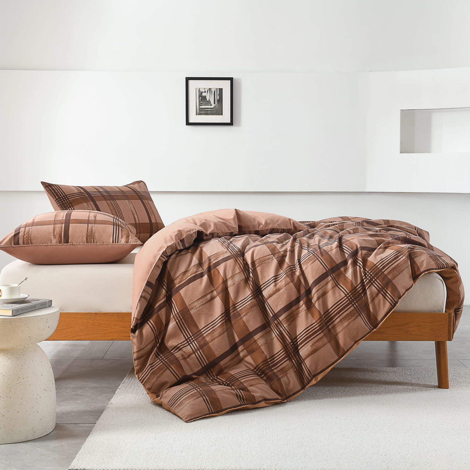 Layered plaid check design – structured pattern softened by subtle tonal texture